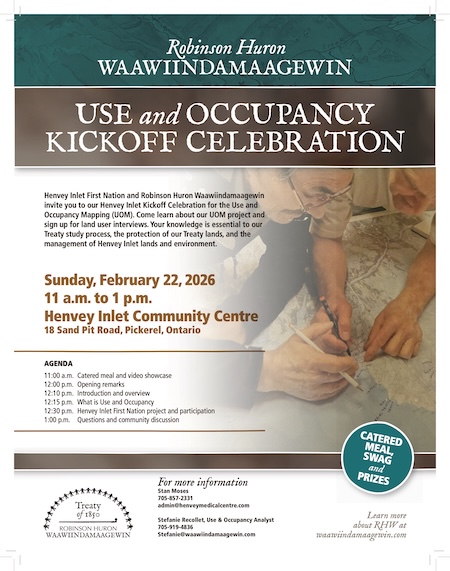 Henvey Inlet First Nation and Robinson Huron Waawiindamaagewin invite you to our Henvey Inlet Kickoff Celebration for the Use and Occupancy Mapping (UOM) project. Come learn about our UOM project and sign up for land user interviews. Your knowledge is essential to our Treaty study process, the protection of our Treaty lands, and the management of Henvey Inlet lands and environment.